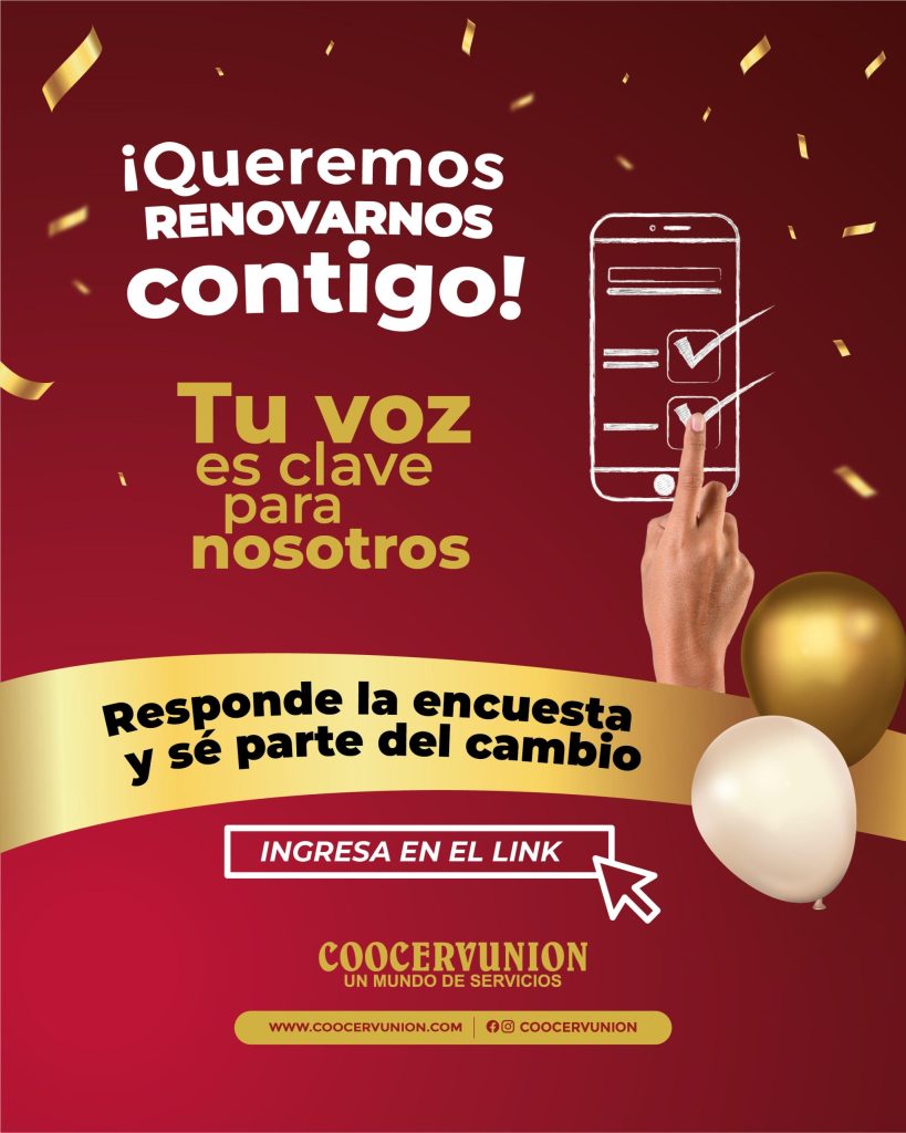 Con el propósito de seguir creciendo y fortaleciendo sus servicios, Coocervunión invita a todos sus asociados a participar en esta encuesta, un espacio creado para escuchar sus ideas, opiniones y expectativas de cómo podríamos renovarnos para ti.